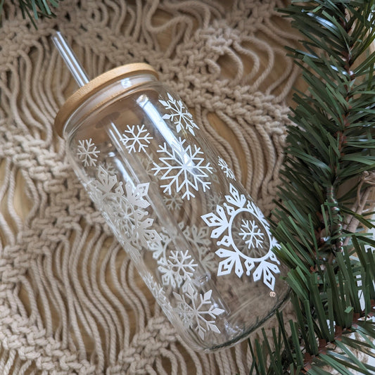 Christmas Snow Storm 16oz glass can or 17oz glass mug with bamboo lid & reusable plastic straw. Christmas gift. Coffee Mug Present snowflake