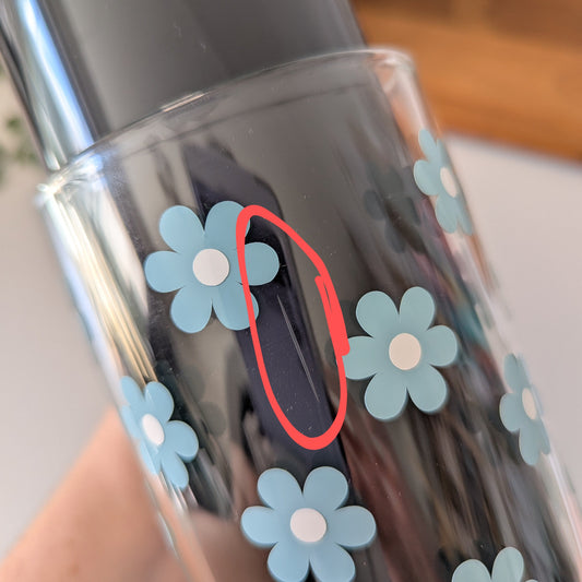 Discounted pastel blue daisy fields vinyl 17oz glass mug with bamboo lid & reusable plastic straw
