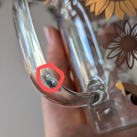 Discounted slightly damaged Golden Sunflower 17oz glass mug with bamboo lid & reusable plastic straw