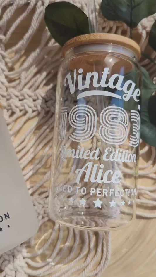 Personalised retro style vintage limited edition glass cup or mug with bamboo lid & reusable straw. Beer mug. Birthday gift. Iced coffee