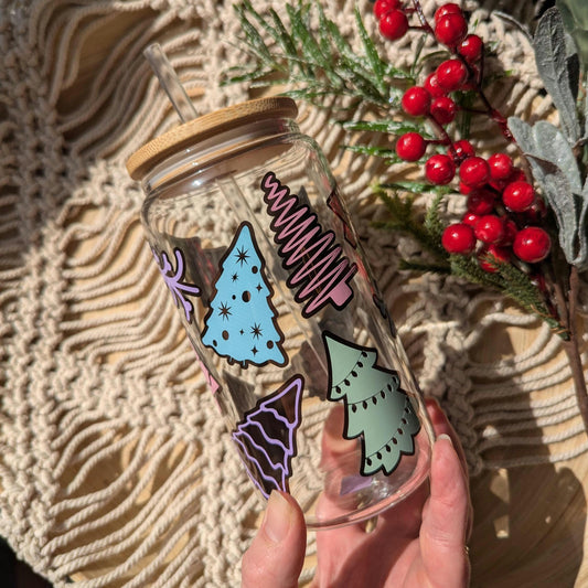 Pastel Christmas Tree Forest 16oz glass or acrylic cup and 17oz glass mug. Festive Gift. Christmas Tree Farm. Coffee cup. Rainbow Trees