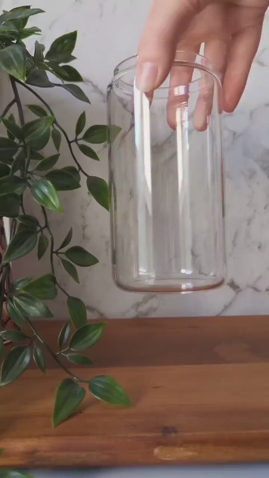 Serenity neutrals & copper design 16oz glass can cup or 17oz glass mug with bamboo lid and reusable straw. Iced coffee Cute cup Brown copper