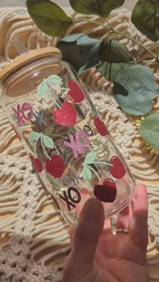 Cherry Kisses glittery 16oz glass cup or 17oz glass mug with bamboo lid &reusable plastic straw. Cute coffee cup. Iced coffee. Valentine's