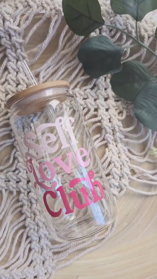 Pink self love club 16oz glass can cup or 17oz glass mug with bamboo lid & reusable plastic straw. Iced coffee cup. Glass mug. Pink theme