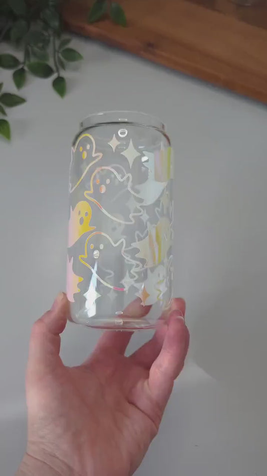 Spooky Ghosts Glow in the Dark 17oz Glass Mug or 16oz Glass Can Cup with Bamboo Lid & Reusable Straw. Halloween. Coffee mug. Iced coffee