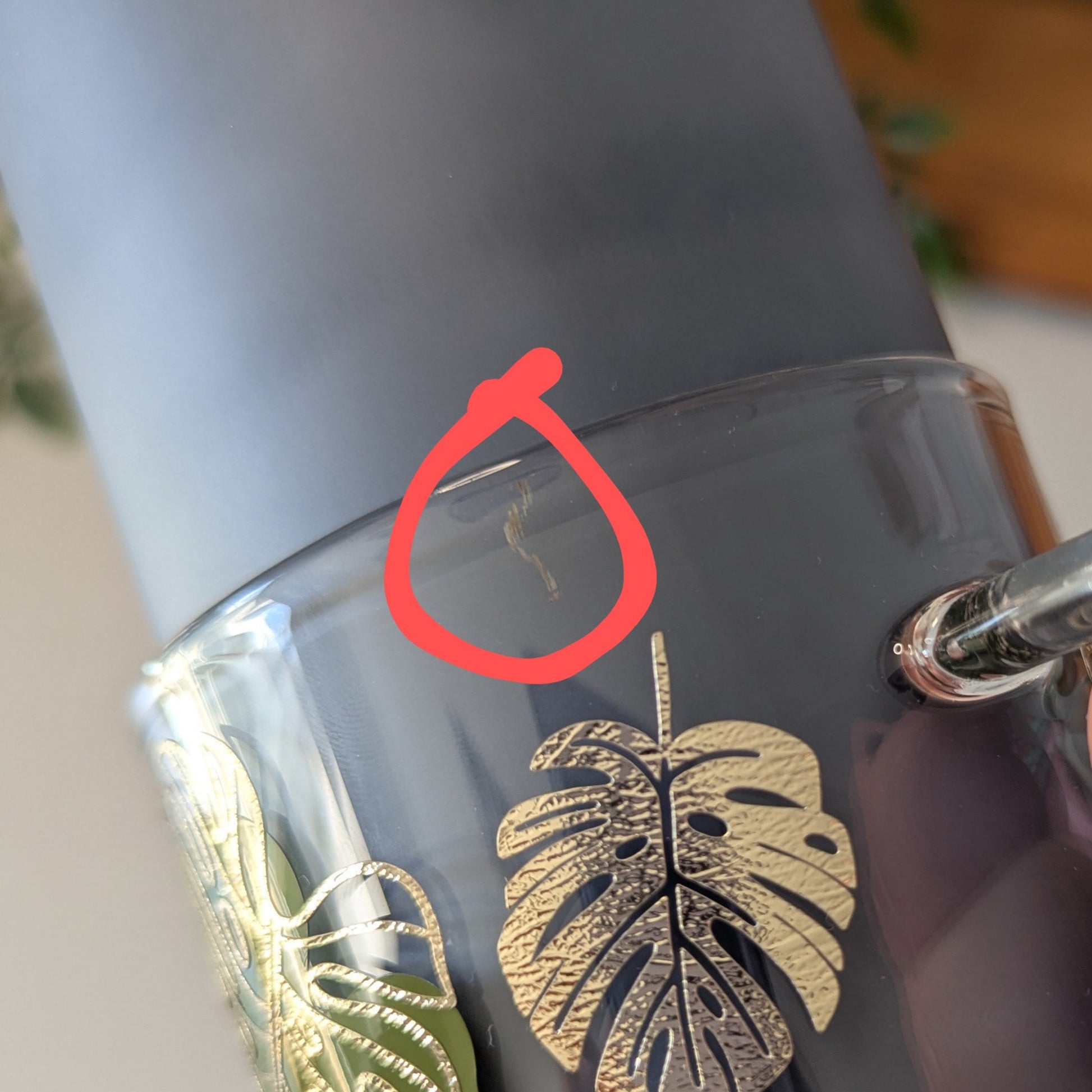 This Monstera design 17oz glass mug was made using the standard process only to find a small blemish in the glass. It is inside the glass itself and doesn't wipe off. It does not affect the use of the mug itself or the design. Full price is $22, this unfortunate cup has been reduced to $14 + shipping